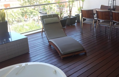 Terraza con jacuzzi para 4 personas con acero inoxidable muebles / madera y tumbonas. Garaje / 2 autos.