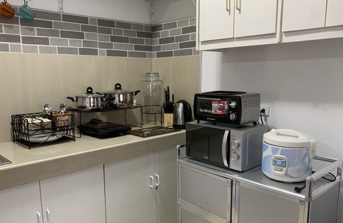 Esta casa cuenta con comodidades completas y más. Cuenta con un televisor inteligente de pantalla grande con WIFI. Los huéspedes pueden usar el teléfono de la casa para hacer llamadas locales si desean pedir comida rápida. La cocina está equipada con una cocina de inducción, microondas, nevera, hervidor eléctrico, arrocera, ollas y sartenes de acero inoxidable, platos y utensilios. Tiene un gran patio delantero con una "cocina sucia" o un lugar para cocinar al aire libre con enchufes eléctricos. Hay un bonito balcón que se abre a las 2 habitaciones de arriba. Dos habitaciones tiene a / c nuevo. Tercera habitación con ventilador. Los baños tienen duchas de agua fría y caliente y bidet. Ropa de cama limpia se proporcionan con toallas limpias.