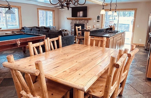 Relájese en la bañera de hidromasaje al aire libre o en la bañera principal para dos. Entretener con facilidad; la planta baja cuenta con una espaciosa sala de estar, comedor y una gran cocina equipada con electrodomésticos de primera línea y encimeras de granito. Todos los baños tienen encimeras de granito y hermosas duchas / baños. Hay una gran cubierta envolvente con vistas de Heavenly y Mt. Talliac Completo con muebles de exterior y parrilla. Hay mucho que hacer, desde herraduras y bochas afuera, hasta billar y futbolín adentro.