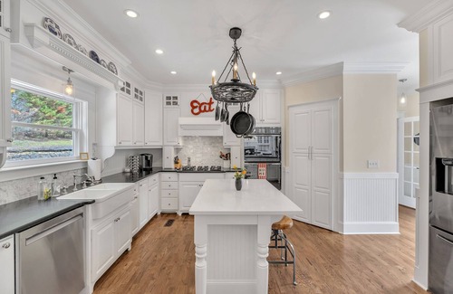 Elegante en todo momento, su magnífico alquiler cuenta con todos los muebles nuevos combinados con antigüedades seleccionadas a mano, cinco salas de estar separadas, una cocina gourmet, dos patios y un gran porche delantero para disfrutar de las hojas cambiantes en otoño, o reunirse y relajarse en los cálidos días de verano. .