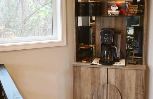 Dentro de nuestra encantadora casa en forma de A, encontrará un espacio de estar cálido y acogedor con una combinación de comodidad moderna y encanto rústico. El piso principal incluye el dormitorio principal con una cama tamaño king y acceso a la espaciosa terraza trasera, donde puede salir para disfrutar del aire fresco de la mañana. También encontrará un baño con inodoro, ducha con azulejos personalizados y espejo de cuerpo entero. La cocina totalmente equipada cuenta con un refrigerador grande, microondas y horno, junto con todos los platos y utensilios que necesitará para cualquier ocasión. Despierta en nuestra barra de café, donde encontrarás una combinación de cafetera Ninja y cápsulas Keurig. Frascos de café recién molido, cápsulas Keurig, azúcar, té y tazas que te invitan a relajarte y disfrutar de tu bebida matutina.