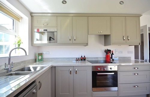 La luminosa cocina / comedor se encuentra en la parte posterior de la casa con vistas al exuberante jardín. La moderna cocina de color topo tiene todas sus necesidades culinarias, incluyendo un horno eléctrico y vitrocerámica, una nevera retro grande, lavavajillas, hervidor de agua, tostadora y cafetera. La mesa de comedor clásica es de roble macizo y tiene capacidad para seis. Las puertas dobles del salón se pueden abrir para crear una sensación de aire abierto en toda la casa. Hay una lavadora y secadora en la letrina.