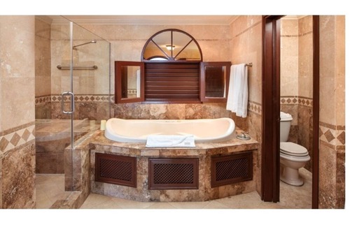 - Los 2 lujosos baños privados con amplio armario, un gran vestidor, bañera de hidromasaje, baño separado, ducha de hidromasaje con múltiples cabezales de ducha y tocador doble.