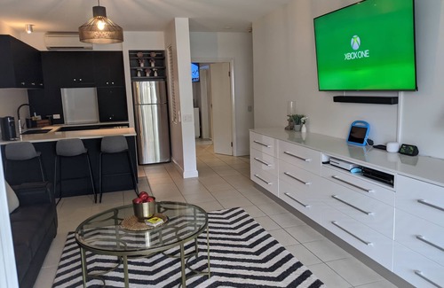 El apartamento está totalmente climatizado y cuenta con ventiladores de techo y persianas de plantación.