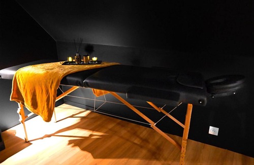 A Queen Size bed with mirrors on the ceiling, an XXL whirlpool bath for 4 people with a 2XL mirror and accessories, a hot stone sauna, a double shower with special columns, a tantra chair, a hanging chair, and a massage table with oils… everything is provided for you to create your own passionate scenes.
