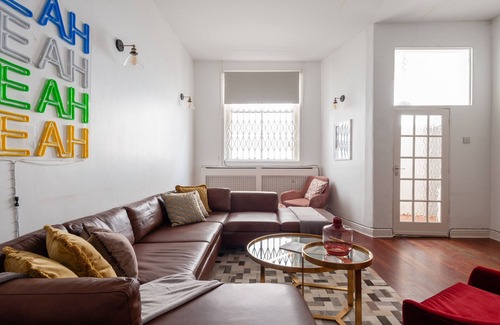 Esta casa está hermosamente renovada con un interior moderno, que combina apariencia y comodidad para crear un espacio en el que disfrutará pasar el tiempo. El área de estar y comedor de planta abierta es ideal para socializar tanto como para relajarse en el sofá. El salón tiene cómodos sofás con muchos cojines y cómodos sillones. Es el lugar ideal para relajarse después de un largo día explorando Londres con un libro o viendo películas en el televisor de pantalla plana. La cocina le ofrece todo lo que necesita y está lista para que la use. Está ubicado justo al lado del comedor en una habitación separada para mayor comodidad. La cocina es sencilla, pero funcional. Es genial preparar un bocado rápido para comer, pero el área de comedor y sala de estar es mucho más espaciosa para disfrutar juntos de la comida. Las cinco habitaciones están equipadas con cómodos colchones y cálidos pisos alfombrados con 4 camas dobles y una litera. Cada habitación duerme cómodamente 2 personas. La casa también cuenta con dos baños completos, uno de ellos en suite para mayor privacidad de los huéspedes. La casa también ofrece WiFi de alta velocidad y espacio para trabajar, en caso de que necesite o quiera trabajar.