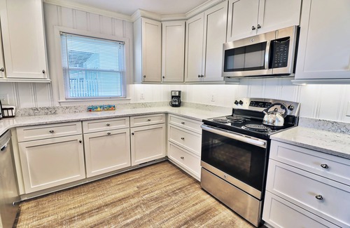 La casa de playa encalada con paneles de pino cuenta con el techo central de la catedral acentuado con amplias ventanas de popa en los extremos opuestos que aportan abundante luz natural. La cocina recientemente renovada y totalmente equipada cuenta con todos los electrodomésticos nuevos y hermosas encimeras de cuarzo. El área de estar se abre a un amplio porche con mosquitero y el área de comedor se abre a una cubierta cubierta y cómodamente amueblada con vista al canal que se combina con mirlos, garzas y garcetas de alas rojas.