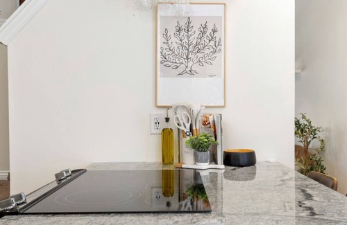 The updated kitchen includes quartz countertops, stainless steel appliances, dishwasher, a full coffee setup, and all the cookware you need to prep a meal. Eat at the kitchen kitchen peninsula or head out to one of the many walkable restaurants nearby.