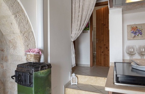 En el interior se pueden ver antiguos muros de piedra expuestos junto con fósiles originales. Estas paredes son tan gruesas que las habitaciones se mantienen frescas incluso en los meses más calurosos. La cocina está equipada con vitrocerámica, horno, nevera, congelador y tostadora. Hay un dormitorio principal con ventana, un dormitorio con dos camas individuales (que se pueden juntar en alguna ocasión) y un baño con ducha, inodoro, lavabo, bidé y lavadora.