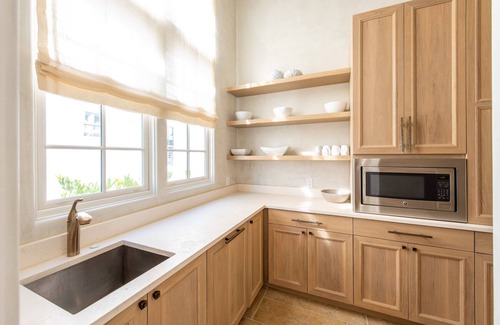 De vuelta al interior, sube las escaleras y entra en el primer dormitorio de invitados, apto para un rey. Detente y admira la vista desde el rincón de lectura adyacente, perfecto para descansar para dos. A unos pasos de una habitación de invitados alternativa, que presenta suaves tonos rosados, con mesitas de noche espejadas, aptas para una reina. Baño de cada habitación de invitados con tocadores individuales y combinaciones de ducha y bañera de mármol. Al final del segundo piso, le espera una sala de lavandería completa, con una lavadora y secadora HE, con mucho espacio de encimera premium para plegar.