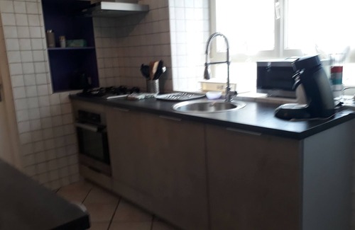 Cocina integrada y equipada, con encimera (vajilla completa, cubertería y utensilios, horno eléctrico, microondas, placa de gas de 4 fuegos, campana extractora, nevera, cafetera senseo, hervidor de agua, tostadora, lavadora y secadora). ..) Abierto al living amueblado con 1 sofá y 1 sofá, mesa de café, TV, wifi de banda ancha por fibra.