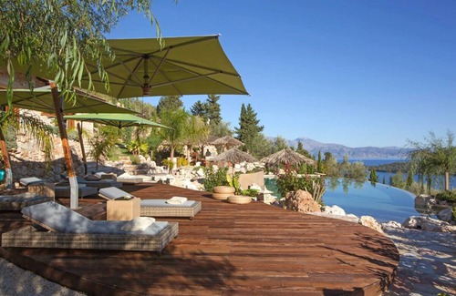 Villa Mimosa se encuentra entre un hermoso follaje exuberante y antiguos olivos. Se acurruca discretamente contra la ladera de la montaña con impresionantes vistas de las muchas pequeñas islas salpicadas en el mar Jónico.