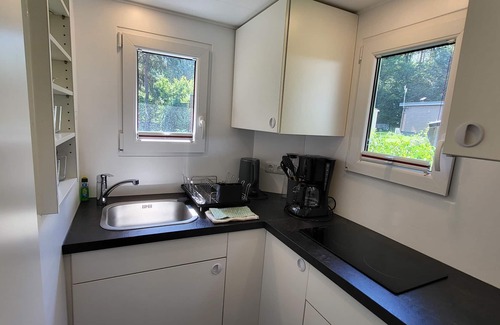 "Tinyhaus 41 Lütt Huus", 1-room mobile home. Object suitable for 2 adults + 1 child. Modern and tasteful furnishings: open living/sleeping room with 1 double bed (180 cm, length 200 cm). Open kitchen (oven, 2 ceramic glass hob hotplates, kettle). Shower/WC. Electric heating. Terrace 15 m2. Terrace furniture. Facilities: hair dryer. Extra. Parking (1 car).