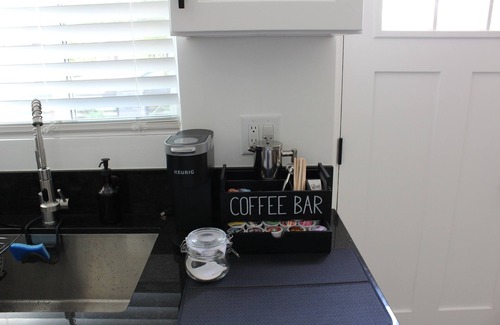 The full kitchen is equipped with everything you need to prepare meals, including a stove, refrigerator, microwave, and all the essential cookware. Start your mornings right with a fresh cup of coffee from the Keurig coffee maker, or whip up a delicious smoothie with the blender. A toaster is also provided for your convenience.