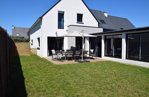 Villa clasificada 4 estrellas con capacidad para 12 personas ubicadas en el pueblo de Plouhinec, a 500 metros de los servicios y 4 km de las playas de arena. Orientación sur, con una piscina cubierta climatizada durante todo el año a 28 °, accesible desde la sala de estar.