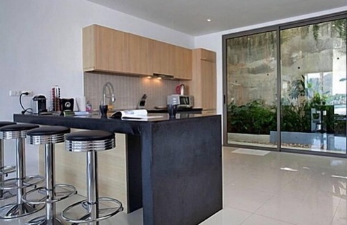 La cocina, de diseño abierto, es de un estándar occidental moderno y viene con lavavajillas, horno, cafetera, nevera / congelador, hervidor de agua, fregadero, cocina de 4 fuegos, tostadora, ventilador, microondas, mucho espacio en el armario, utensilios de cocina, vajilla y vasos para vino, champaña y cerveza. Hay mucho espacio de trabajo y las superficies de trabajo son elegantes de granito negro. Los huéspedes pueden comer en la mesa del desayuno / comedor en la cocina mientras disfrutan de las vistas panorámicas elevadas de la bahía de Patong.