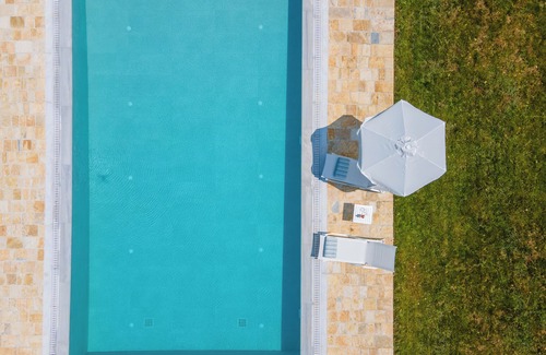 The outdoor areas are as much a part of the experience as the interiors. Whether you’re lounging poolside with a book, sharing a drink beneath the stars, or wandering among the olive trees in golden afternoon light, the villa encourages a slower, softer pace. Landscaped yet natural, private yet open, the grounds are beautifully in tune with their setting. At night, subtle garden lighting brings a gentle magic to the space, while the warm stone terrace and cicada-filled air set the tone for long, effortless evenings.