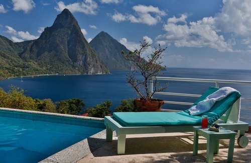 Justo al lado de la sala de estar, cinco pasos abajo suspendidos en el borde de la ladera, una gran piscina infinita se enfrenta a los majestuosos Pitons. Las grandes terrazas con tumbonas están protegidas por una cabaña.