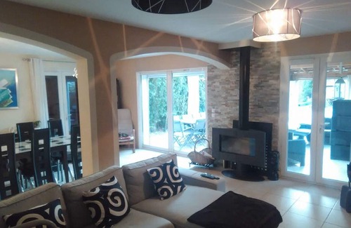 Tipo de casa de campo reciente, amplio estacionamiento cerrado para autos, gran terraza de 40 m2 con área de muebles de jardín para 10 personas y área de comedor al aire libre para 10 personas, piscina climatizada de 8x4m, filtración de sal, 4 habitaciones disponibles arriba con 1 habitación grande Baño, bañera + ducha, en la planta baja una sala principal con cocina totalmente equipada (lavavajillas, lavadora, horno y electrodomésticos), área de descanso. 2 baños, barbacoa de gas disponible, la casa tiene aire acondicionado.