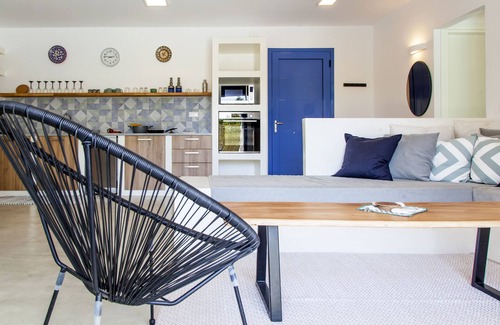 Cuando ingresas a Villa Galini entras en la gran sala de estar que ofrece la cocina abierta totalmente equipada, cómoda sala de estar y comedor. Como la Villa está construida en un solo nivel, todo el frente de la Villa ofrece puertas corredizas de vidrio que permiten el acceso directo al área de la piscina y llenan todas las habitaciones con luz solar brillante.