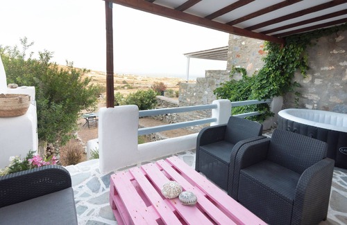 Esta villa con aire acondicionado es única ya que combina la arquitectura tradicional de las piedras de las Cícladas y al mismo tiempo el enfoque de decoración minimalista. Está totalmente equipado con caldera para microondas, horno de agua caliente y lavadora. TV plana de 55 pulgadas, home cinema, lo que hace que los huéspedes se sientan como en casa.