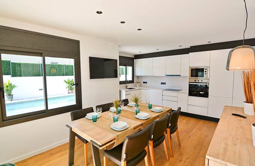 Una espaciosa villa ideal para familias o grupos, esta acogedora casa vacacional tiene capacidad para 8 personas en tres dormitorios. Ofrece dos camas dobles, dos camas individuales y una litera, ideal tanto para adultos como para niños. La casa incluye un amplio salón, una moderna cocina americana y dos baños con ducha. En el exterior, los huéspedes pueden disfrutar de una piscina privada, un amplio jardín y una terraza ideal para comer al aire libre. Se admiten mascotas, siempre que no sean de razas peligrosas y pesen menos de 5 kg. Se pueden alquilar extras opcionales como cunas, tronas y toallas de piscina. Ubicada en una tranquila zona residencial de L'Escala, la villa se encuentra a solo 10 minutos a pie de la playa de Riells. Conocida por sus aguas poco profundas y arena suave, la playa es ideal para niños. El cercano paseo marítimo ofrece una variedad de restaurantes, bares, tiendas e instalaciones para practicar deportes acuáticos. Los huéspedes también encontrarán supermercados y lugares de ocio a poca distancia. Las opciones de transporte incluyen una estación de autobuses a poca distancia en coche, mientras que el Aeropuerto de Girona-Costa Brava está a unos 53 km de la propiedad, lo que ofrece un cómodo acceso para viajeros internacionales. Las comodidades adicionales aumentan la comodidad y la practicidad de la villa. Estas incluyen lavadora, acceso a internet, calefacción, aire acondicionado (según la temporada) y garaje. La cocina está totalmente equipada con vitrocerámica, horno, frigorífico, congelador, lavavajillas, microondas, cafetera, tostadora, hervidor de agua y exprimidor. [Nota: La piscina comunitaria está disponible exclusivamente durante julio y agosto].