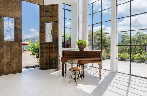 Rodeada del colorido cultivo de las más variadas especies de flores, se encuentra una hermosa casa con enormes ventanales de vidrio que permiten la entrada de luz natural y forma hermosos diseños y sombras en todas sus estancias. Desde las grandes puertas adornadas con cuadros pintados a mano, se extiende el salón y el comedor, completo con una mesa de billar, y conduce a la elegante y muy bien equipada cocina situada en la parte trasera. Los techos altos aportan una sensación de amplitud y confort. Todos los ambientes fueron delicadamente decorados con piezas encontradas en todo el mundo, suites sumamente espaciosas, camas súper cómodas, balcones con vista al verde en todas las habitaciones y todo lo necesario para promover, quienes se hospedan aquí, estaciones increíblemente tonificantes.
