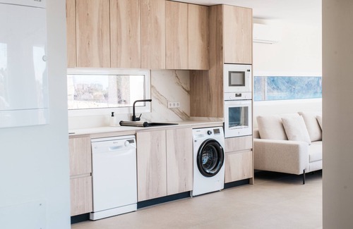 Cocina con encimera y horno eléctricos, microondas, lavavajillas, refrigerador-congelador, cafetera, calentador de agua, batidora, tostadora, exprimidor y lavadora.