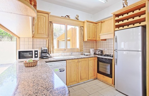 La planta baja de la villa es amigable para los huéspedes con dificultades de movilidad, y ofrece todas las facilidades para unas vacaciones relajadas lejos de todo. La sala de estar es de planta abierta con un toque tradicional chipriota pero muy cómoda. Hay amplios asientos y comedor. El televisor es un Smart TV con caja de Android para una amplia selección de canales. Hay un sofá cama en esta área para dar cabida a una novena persona. La cocina está totalmente equipada.