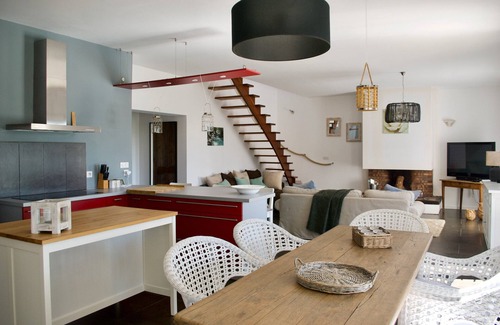 La planta baja sirve una gran sala donde se combinan cocina, comedor y sala de estar. Las grandes ventanas francesas tienen la doble ventaja de que la habitación es muy luminosa y permiten el acceso directo a la terraza.