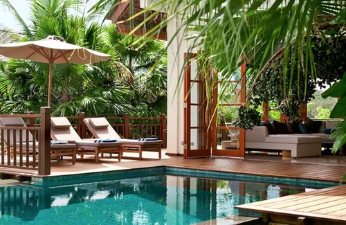 Planta baja a nivel de jardín. Se accede a la espaciosa habitación a través de una escalera cerrada que baja desde la sala de estar y también tiene una entrada completamente separada de las instalaciones del complejo, lo que la convierte en una buena opción para los huéspedes que gustan de las salidas nocturnas. Esta habitación está equipada con una cama doble con dosel, un sofá con mesa de café y un baño en suite con ducha al aire libre y bañera. Las puertas corredizas miran hacia un pequeño jardín con flores tropicales.
