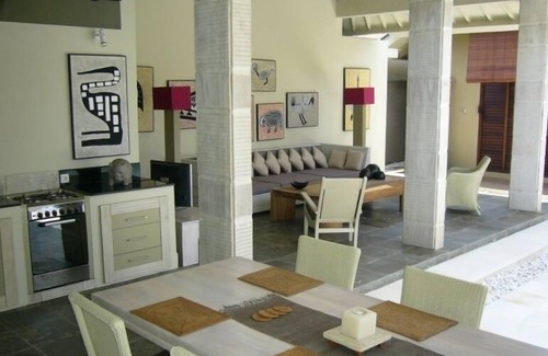 Villa Sukapadi se encuentra junto a la calle de restaurantes de moda de Jalan Laksmana. Villa Sukapadi ofrece una villa moderna y confortable con una decoración étnica de buen gusto para mejorar sus vacaciones en Bali. La bien equipada villa de dos dormitorios fue decorada por un diseñador francés con piezas tradicionales de Timor, combinadas con obras de arte originales de hoy en día y una decoración minimalista. Con su ambiente conmovedor y su ambiente hogareño, esta villa seguramente se convertirá en su hogar lejos de casa en Bali. La propiedad de 400 metros cuadrados se encuentra al final de una calle tranquila entre otras residencias de villas privadas. Las áreas de estar y comedor se envuelven alrededor de una hermosa piscina infinita de 11 x 3. 5 metros con bancos submarinos para relajarse en el agua y tumbonas para disfrutar del clima tropical. El primero de los dos pabellones contiguos alberga los espacios abiertos de sala y comedor con un excelente sistema de entretenimiento en el hogar con TV de pantalla plana y reproductor de DVD. Relájese con más de 65 canales de televisión por cable con programas en inglés, español, francés, ruso y alemán. La sala de estar es un área acogedora para conversar, relajarse y leer en un sofá extralargo con abundantes cojines suaves. Toda la villa está equipada con Wi-Fi para uso de Internet. Disfrute cuando se hospede en la conmovedora y hogareña Villa Sukapadi en sus próximas vacaciones en Bali. Los pisos de las villas de piedra de pizarra de oro negro son importados de la India y son totalmente naturales y varían en color con tonos de gris oscuro, oro y rayas negras. El espacio para comer tiene capacidad para 6 personas en una mesa de teca y está justo al lado de la cocina para facilitar el servicio y mantener fluida la conversación de una habitación a otra.