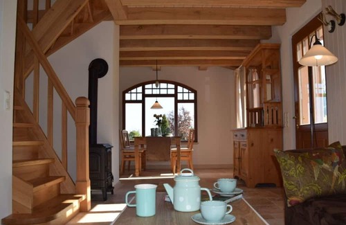 Het vakantiehuis bevindt zich op een prominente locatie, midden in een prachtige tuin van ongeveer 5000 m² (de grote diversiteit aan planten maakt een bezoek in elk seizoen mogelijk!) met een grandioos uitzicht over het Weserbergland.