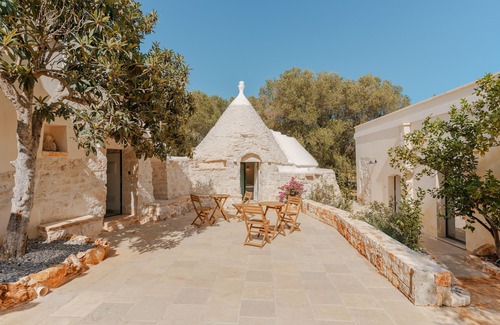 Set among the olive trees is this wonderful villa with trulli, featuring a beautiful rock garden, terrace with furnished solarium, lounge and outdoor dining table, and a mini golf course for enthusiasts.