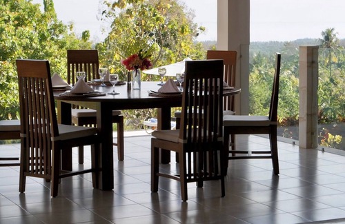 La terraza del comedor tiene capacidad para hasta 10 personas, donde se puede disfrutar de la cena y las bebidas que rodean el espectacular paisaje. Hay un gran diván balinés tallado a mano en el comedor de la cocina.
