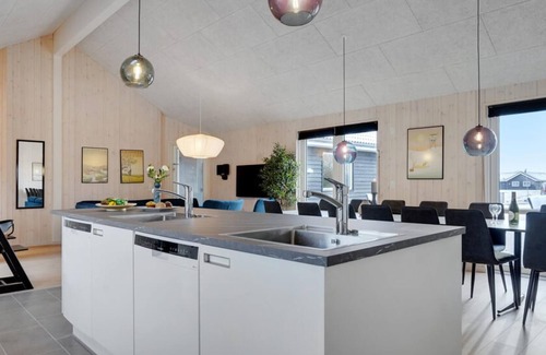 This holiday property, located near the beach in Mommark on the island of Als, offers a perfect blend of comfort and fun activities for up to 20 guests. The house features an indoor swimming pool with a water slide, Roman steps, and a counter-current system, along with a whirlpool and sauna for a wellness experience. The living area is cozy with a dining table, sofa corner, and a wood-burning stove, while the kitchen is spacious and well-equipped. An activity room offers games like table football, darts, billiards, and table tennis, and also includes a TV and PlayStation 4. The house has eight double bedrooms, a loft with four mattresses, and four bathrooms. Outside, a partially covered terrace is perfect for barbecues or sunbathing, and there\'s an in-ground trampoline for kids.