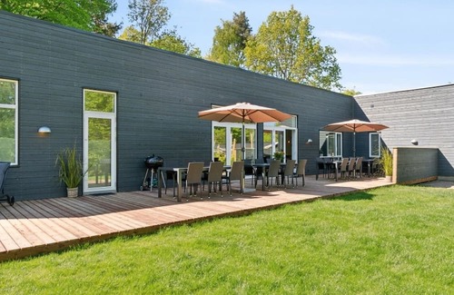 This modern holiday home near Rågeleje and Vejby Strand on the Kattegat coast is perfect for large families or groups of friends. It features eight bedrooms, two sleeping areas with showers and toilets, a loft for children, and a fitness room. The fully equipped kitchen and cozy lounge area make it ideal for gatherings. \r\nEntertainment options include darts, table tennis, billiards, table football, Nintendo, and a bar with a TV for sports. The fitness room has yoga mats, TRX equipment, and a wallbar. For relaxation, there\'s a luxurious pool area with a sauna, hot tub, and large indoor pool. The spacious wooden terrace with a barbecue and the enclosed garden with swings, a sandpit, and outdoor games offer great outdoor fun. Nature lovers can enjoy a cozy shelter under the open sky. The house also provides a charging point for electric cars, ensuring a convenient and enjoyable stay for all.