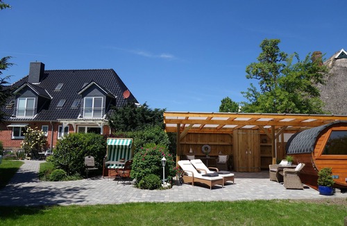 Relájese en las cómodas tumbonas de mimbre, en la popular silla de playa o en los cómodos sillones de mimbre, envueltos en suaves albornoces y cálidas mantas de lana. La terraza cubierta y luminosa al aire libre junto a la sauna le ofrece un lugar protegido del viento y la privacidad.