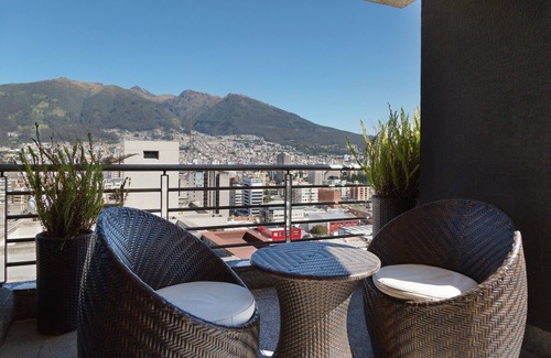 Suite con ventanales de vidrio por todos lados y un fantástico balcón en la esquina, cuenta con una hermosa vista al volcán Pichincha y centro-norte de la ciudad, ubicada en una de las mejores zonas de Quito, cerca del centro histórico, disponible para visitas Ejecutivas y Turísticas en la ciudad.