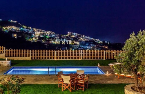 (3000m2), situado en una colina sobre la ciudad de Skopelos, esta villa está rodeada de olivares y senderos para caminar y vistas al puerto de Skopelos. Hay un patio accesible desde la cocina que está amueblada con una barbacoa. Además, hay una terraza con vistas a la montaña y el mar que está amueblada con una mesa de comedor con sillas. La piscina privada (50m x 4. 7. 00m) está enmarcado por una terraza con tumbonas y sillas. El aparcamiento está disponible dentro de los terrenos de propiedad.