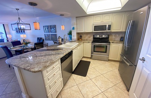 Bay View Tower 535: ¡Disfruta desde tu balcón proyectado, hermosas vistas de la isla de Sanibel y puestas de sol todas las noches sobre las aguas cristalinas y las islas de barrera! Al igual que todos nuestros alquileres de vacaciones en Fort Myers, Florida, este condominio está bien equipado e inspirado en la vida marina. Esta unidad tiene pisos de baldosas en todo, cocina y baños renovados. El dormitorio principal tiene una cama King y el dormitorio de invitados tiene una cama doble y doble. Hay una gran televisión de pantalla plana en la sala de estar y las dos habitaciones, y un reproductor de DVD en la sala de estar.