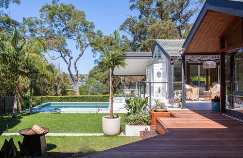 Mirroring its peaceful surroundings, this spacious 4-bedroom home exudes, natural elegance and a resort-style vibe. Natural light and a clever airflow fill the main living space with an outdoorsy calmness, mirrored in the breathtaking natural straw ceiling which cocoons the room in a remarkable piece of architecture and engineering. Beneath the soft ceiling, you’ll find a variety of open-plan living spaces that you’ll be hard-pressed to leave. An open-plan kitchen is in the centre of the space, where brilliant white countertops reflect the light across the convenient island and breakfast bar. To the left of the kitchen a hardwood dining table is the setting for glamorous formal dinners, seating up to 8 guests. Adjacent to the dining table is your first living area, where deep blue sofas offer a cosy escape from the day. A second sitting area is available on the other side of the kitchen, where a lighter arrangement of squashy grey and white chairs are arranged around a modern fireplace - ideal for cooler daytimes. Boasting purpose-designed entertainment this home delivers a memorable escape for the whole family. Downstairs there is a gym area and yoga space, with free weights for a morning workout. Head back up to the main living level, you’ll also find a games room with a ping-pong table, and dartboard, as well as a bar and fridge, which opens directly to the deck. From here keep active with a few laps in the heated pool, or take a more restful approach making full use of the spa facilities. Better still sink into the outdoor sofas and admire the water view, as you cook up an alfresco feast at the BBQ. Or feeling energetic, shoot some hoops in the front garden or take out the paddle board or canoe on the Lane Cove river, accessed from the back yard gate that takes you directly onto the picturesque Tambourine Bay park and waterfront jetty area.