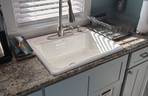 Esta casita de 1920 fue renovada en 2016 y tiene todas las características modernas que puede esperar en un espacio tan pequeño. Elija dormir en el sofá desplegable American Leather con colchón Queen Memory Foam o en el colchón tamaño king que sube las escaleras en el desván. Tanto el aire acondicionado como el calor mantendrán el espacio a la temperatura que más le guste, con un ventilador de techo que proporciona una circulación de aire de varias velocidades. TV de pantalla plana con cable está disponible junto con WiFi. La cocina, con su generosa encimera de granito, está totalmente equipada con estufa de gas, microondas y refrigerador debajo del mostrador. Hay una mesa plegable disponible para comidas tranquilas en el interior, pero si el clima lo permite, hay una gran área de comedor al aire libre para su uso, con una parrilla de gas sin tanque para arrancar.