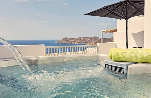 Comfortably sized and stylishly decorated, our Prestige Guestrooms with outdoor Jacuzzi, offer the luxury conveniences and high quality services of a 5 star luxury resort provided by our experienced and welcoming staff. Featuring an outdoor Jacuzzi and a sunbathing terrace with view of the Aegean Sea and pristine Elia Beach, these prestige accommodations showcase Mykonos hospitality at its best.