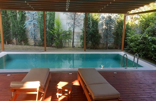 The villa is a very big modern villa .It is located at *Porta e Gjelber * Residence and it has 3 floors.On the -1 floor there is a wardrobe,the sauna and a bathroom.At the 0 floor there is the living room with a fire place and a big kitchen which is divided from the living room.On the 1 floor there are 2 bedrooms and 2 bathrooms.Outside there are 2 free parking available and the big provate ,heated pool sorounded by trees..Its 10 minutes far from the city center and 10 minutes far from the artificial Lake of Tirana.